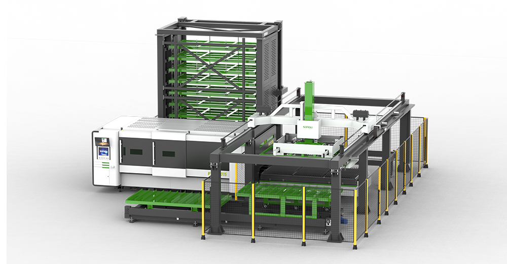 在松谷激光切割機的切割平臺上搭載HyStore系列自動上下料及倉儲系統,通過軟件控制系統進行串聯控制,實現無人值守的全自動化智能激光切割生產線;