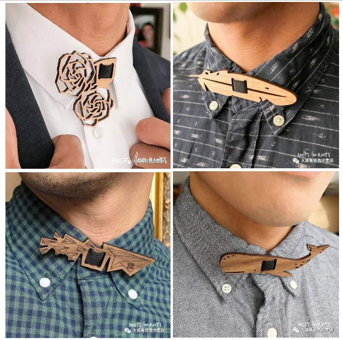 領(lǐng)結(jié)曾被誤認(rèn)為是專屬于正式和隆重的慶典、年會(huì)、酒會(huì)等場(chǎng)景,其實(shí)不然,領(lǐng)結(jié)能游走在正式場(chǎng)合,同時(shí)也具有休閑的特質(zhì)。通過(guò)無(wú)接觸性的木板激光切割機(jī)切割木質(zhì)領(lǐng)結(jié),不會(huì)壓壞板材且邊緣光滑無(wú)毛刺,深色的邊緣加強(qiáng)了顏色的對(duì)比度,使得領(lǐng)結(jié)看起來(lái)就像似可穿戴的現(xiàn)代藝術(shù)品。