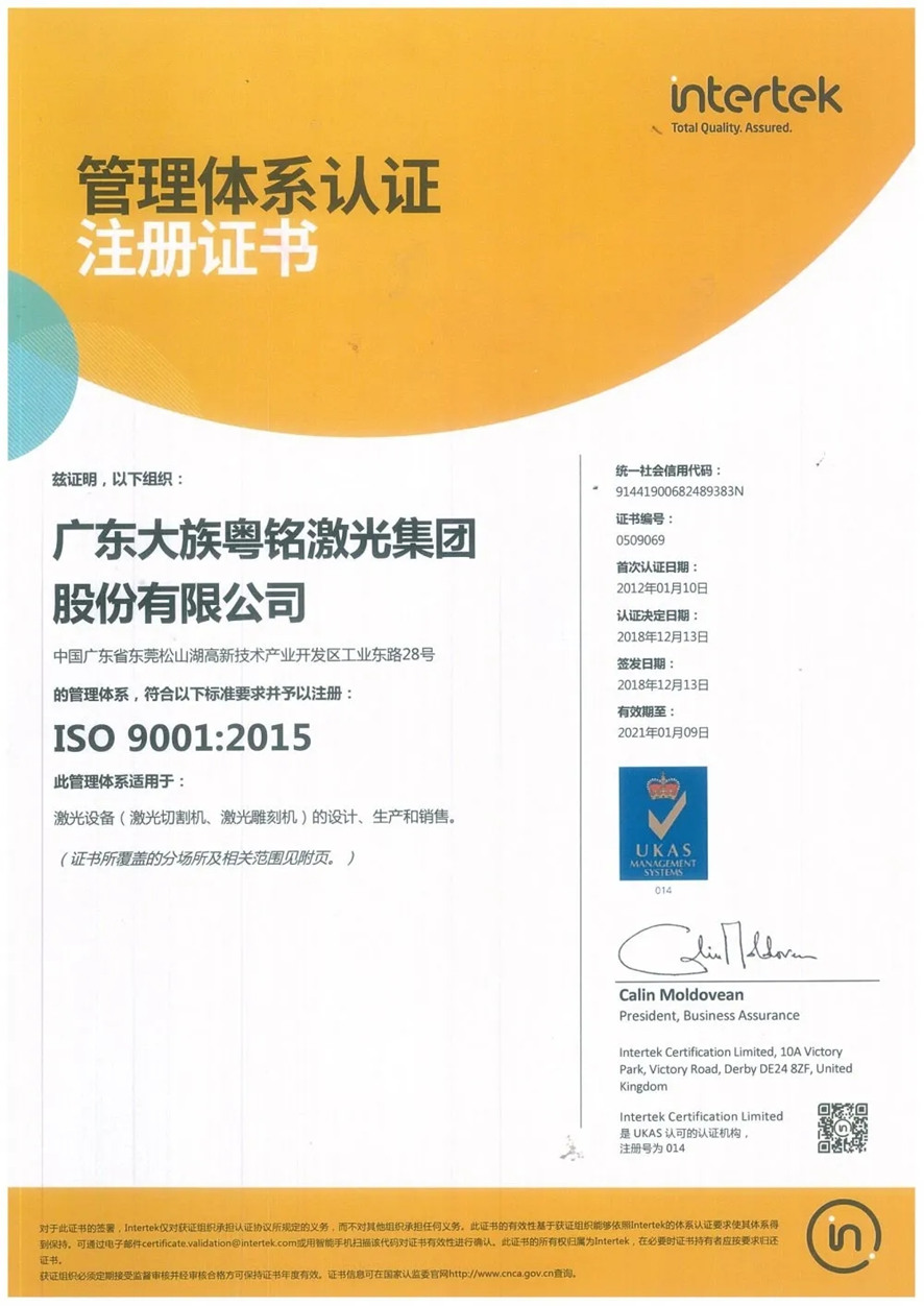 一直以來,大族粵銘激光集團都秉承國際化理念、本土化創新、中國式管理的發展思路,先后導入了ISO9001質量管理體系、SAP信息化管理系統、知識產權管理體系等管理手段。這些管理體系和工具為企業提升了管理效能,改善了經營業績。近幾年來發展令行業矚目,產值產能不斷逆勢上揚,在市場上獲得了廣大客戶的認可。在企業發展過程中,先后獲得東莞市政府質量獎鼓勵獎、中國產學研合作創新獎、國家高新技術企業稱號、中國輕工業科技百強企業稱號、廣東省名牌產品稱號、入選市倍增計劃試點企業等榮譽。這不僅是企業自身的發展成果,也是東莞市委、市政府營造“親商、愛商、護商”良好經營氛圍下的發展結晶。