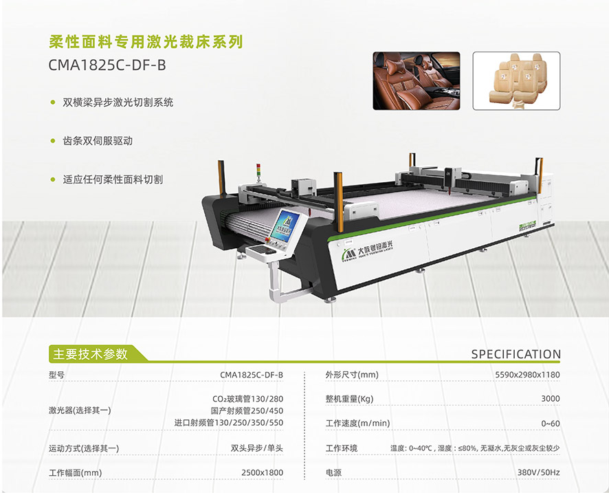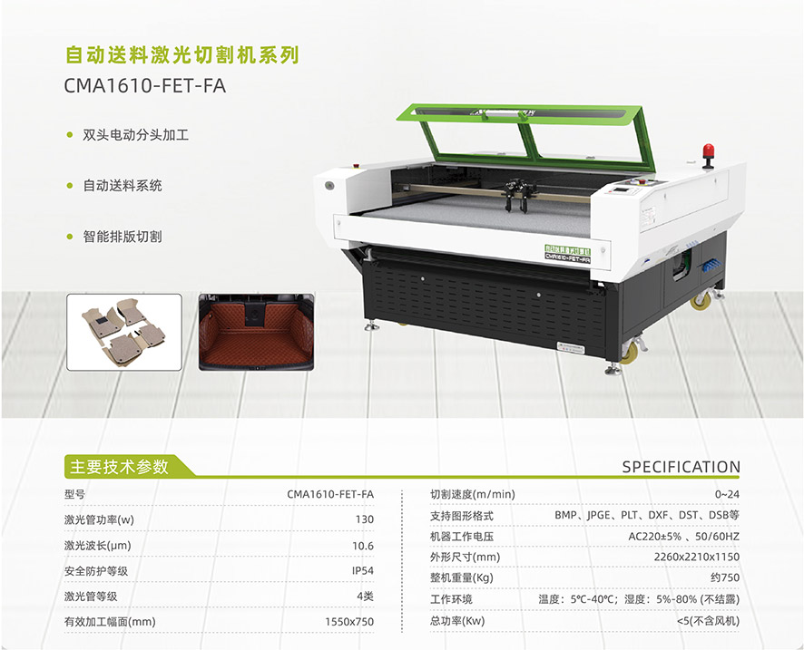 在汽車內飾產品加工中,激光切割機可對座墊、座套、頂蓋內襯、車身內護、頸枕、抱枕、剎車套、掛擋套、地毯等汽車內飾產品進行靈活性加工。通過激光切割機可根據不同車型內飾尺寸進行靈活快速制圖裁剪,從而成倍地提高產品加工效率。