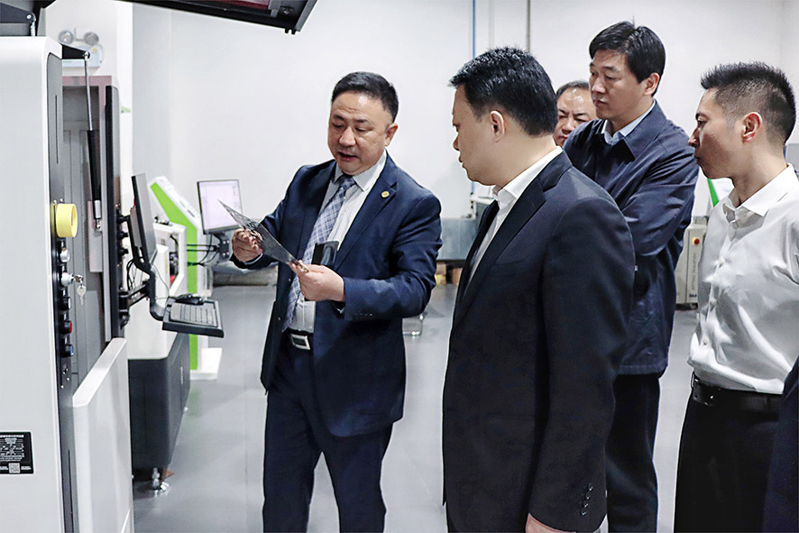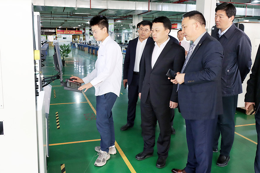 在卓勁松總經理的陪同下,蘇偉書記及縣委和縣政府的其他領導觀摩了粵銘激光集團現代化智能制造總裝車間、研發中心與激光設備展示廳,對我司近年來布局3C、5G、新能源汽車、制衣制鞋、家具家居等行業各系列高端激光裝備的技術亮點及生產流程進行了實地考察了解。