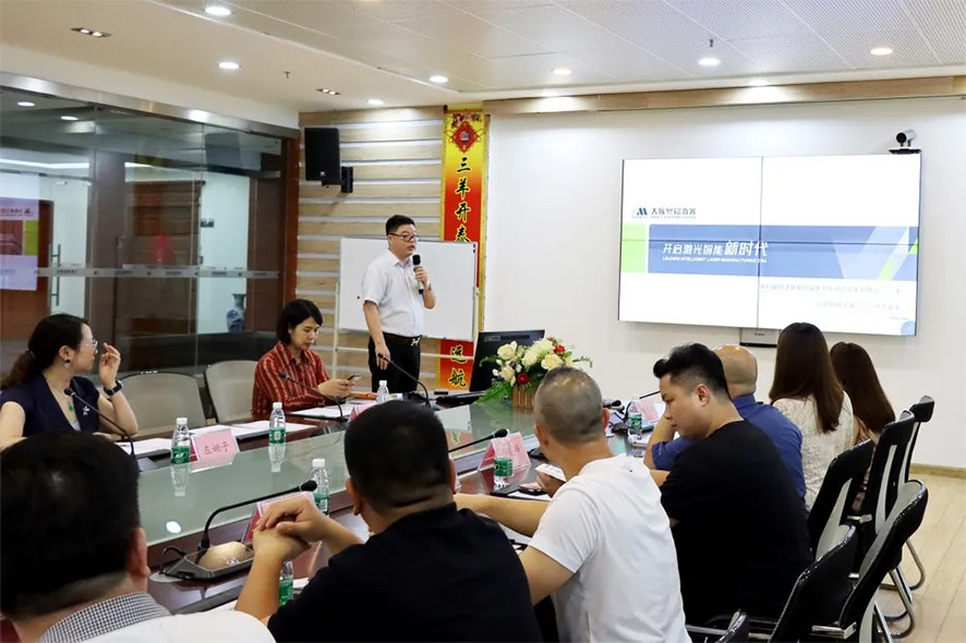 隨后,雙方在四樓大會議室進行了深入友好地交流。王總再次對莞佛兩地企業家聯合會一行的到來表示熱烈歡迎及感謝,希望通過此次的交流溝通,加深彼此之間的友誼和信任。在交流座談會上,王總進一步對粵銘激光集團公司發展歷程、企業文化、技術研發亮點進行了介紹,并結合生活生產,深入淺出的介紹了粵銘激光集團各類高端激光設備產品應用領域及優勢。