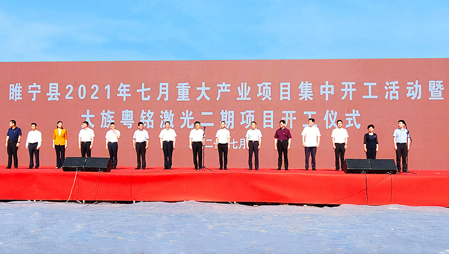 2021年7月10日上午,粵銘激光集團在江蘇省睢寧生產基地隆重舉行“大族粵銘激光集團睢寧生產基地二期工程擴建項目開工儀式”,粵銘激光集團的大型數字化激光裝備制造基地擴建工程在江蘇省睢寧生產基地正式落地。