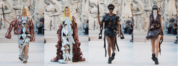 在加工精度高的激光切割技術協助下,幾何圖案切口光滑無毛邊,疊加后營造起豐富層次感。皮質長裙拼接打破了身體原有曲線,配合著火炬演出,將Rick Owens想表達的希望和恐懼的情緒推到高點。