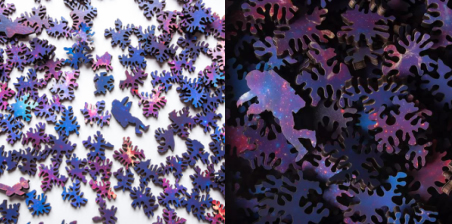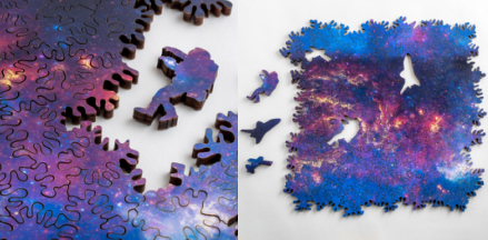整套拼圖只有133塊,但我們可以從任意一塊出發(fā)開(kāi)始構(gòu)建群星閃爍的銀河系。激光切割工藝屬于非接觸性的加工,不存在工具的磨損,制成每一小塊之間的聯(lián)系隨機(jī),圖像隨著拼湊延伸不斷變化,就如同身臨其境地探索星系。