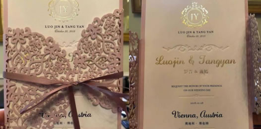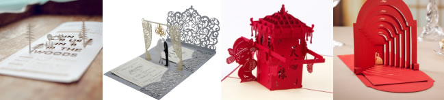 婚禮請柬完全可以摒棄正正方方的外觀,在電腦上制圖后,婚禮請柬激光鏤空機就能不受限制地依據圖紙上的內容制作出所需要的圖案或文字內容,打開請柬后便能出現立體的圖形。