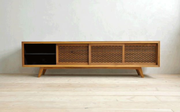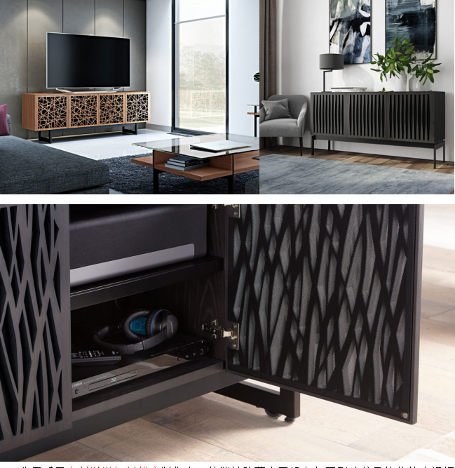 BDI公司采用木材激光切割裁床制作出一款能夠隱藏電子設(shè)備但不影響信號(hào)接收的電視柜,在計(jì)算機(jī)上制圖后,激光切割機(jī)就能按照預(yù)設(shè)圖形切割出所需要的三種不同紋路的電視柜門,不僅提高美觀度,還為電子設(shè)備提供了通風(fēng)散熱的功能。