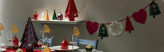 在精度可達毫米之內的激光切割工藝加持下,輕便的紙張在圣誕節中擁有了各種裝飾姿態。或是懸掛在頭頂上的紙燈、或是放置在圣誕大餐前的紙質圣誕樹、或是纏繞在杯子蛋糕上的“衣裳”、或是緊抱在高腳杯“大腿”的圣誕樹、或是依偎在杯沿的小鈴鐺……
